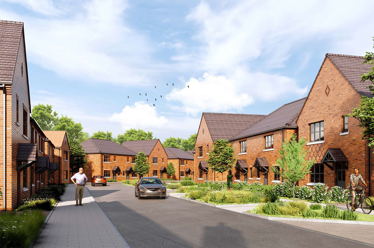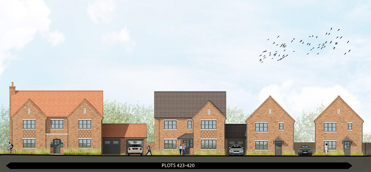 The entrance from Bradmore Lane forms a green, welcoming gateway into the development. Two-storey homes frame the approach, reflecting the rural character of the lane. A generous main street leads from this point towards the heart of the scheme, incorporating swales, street trees and a segregated cycle route. The alignment draws views southwards to a landmark building and the central green space.