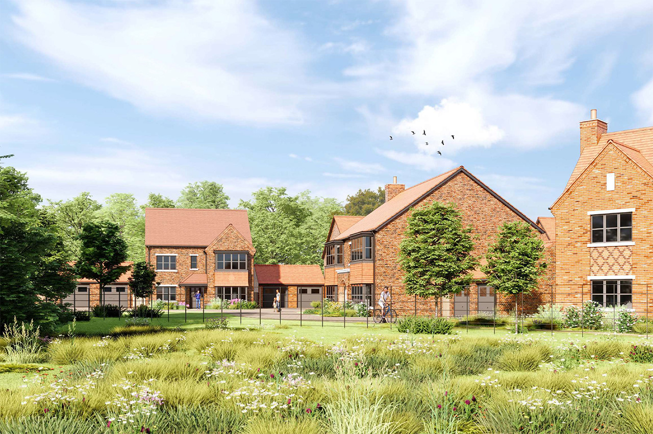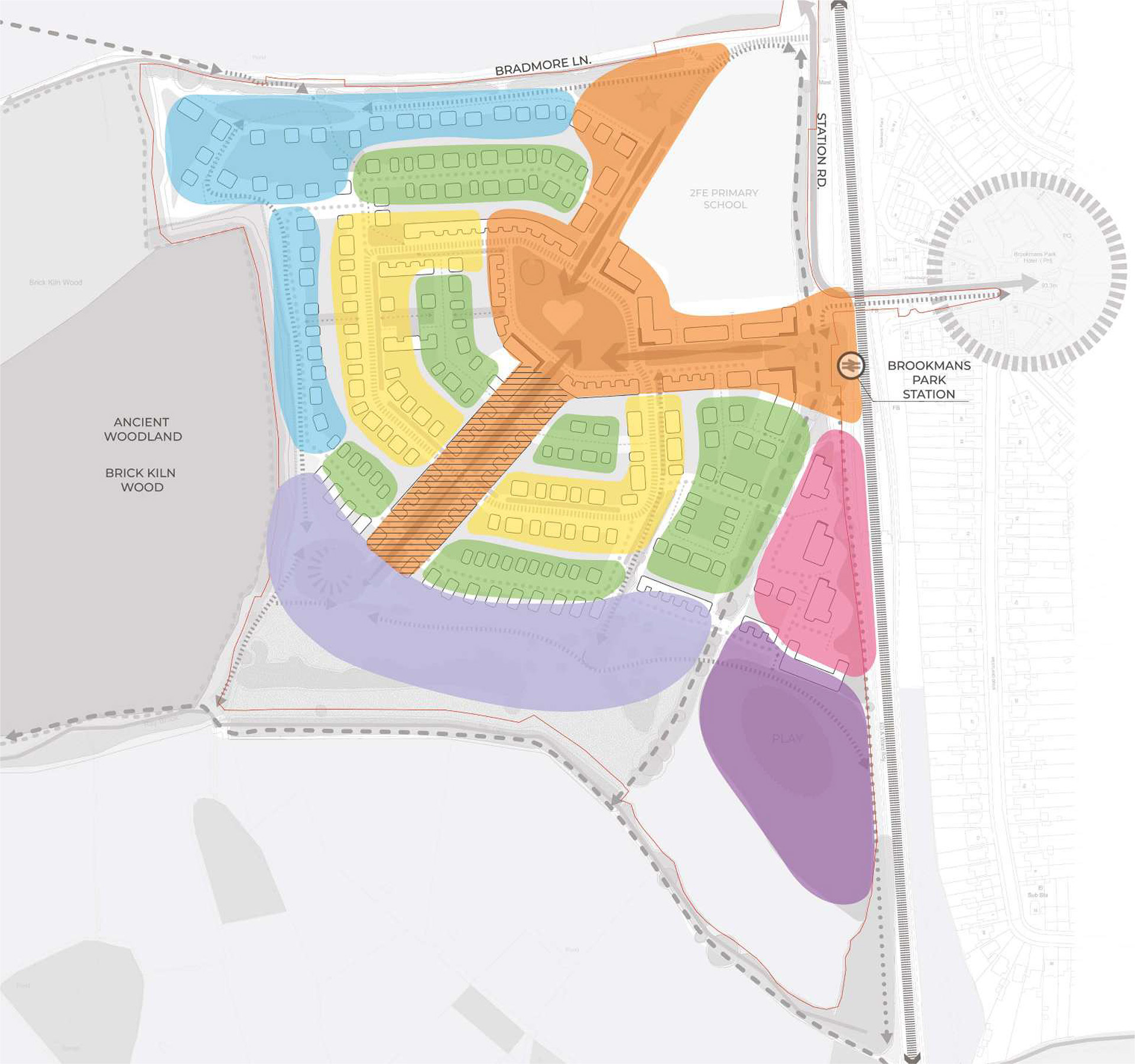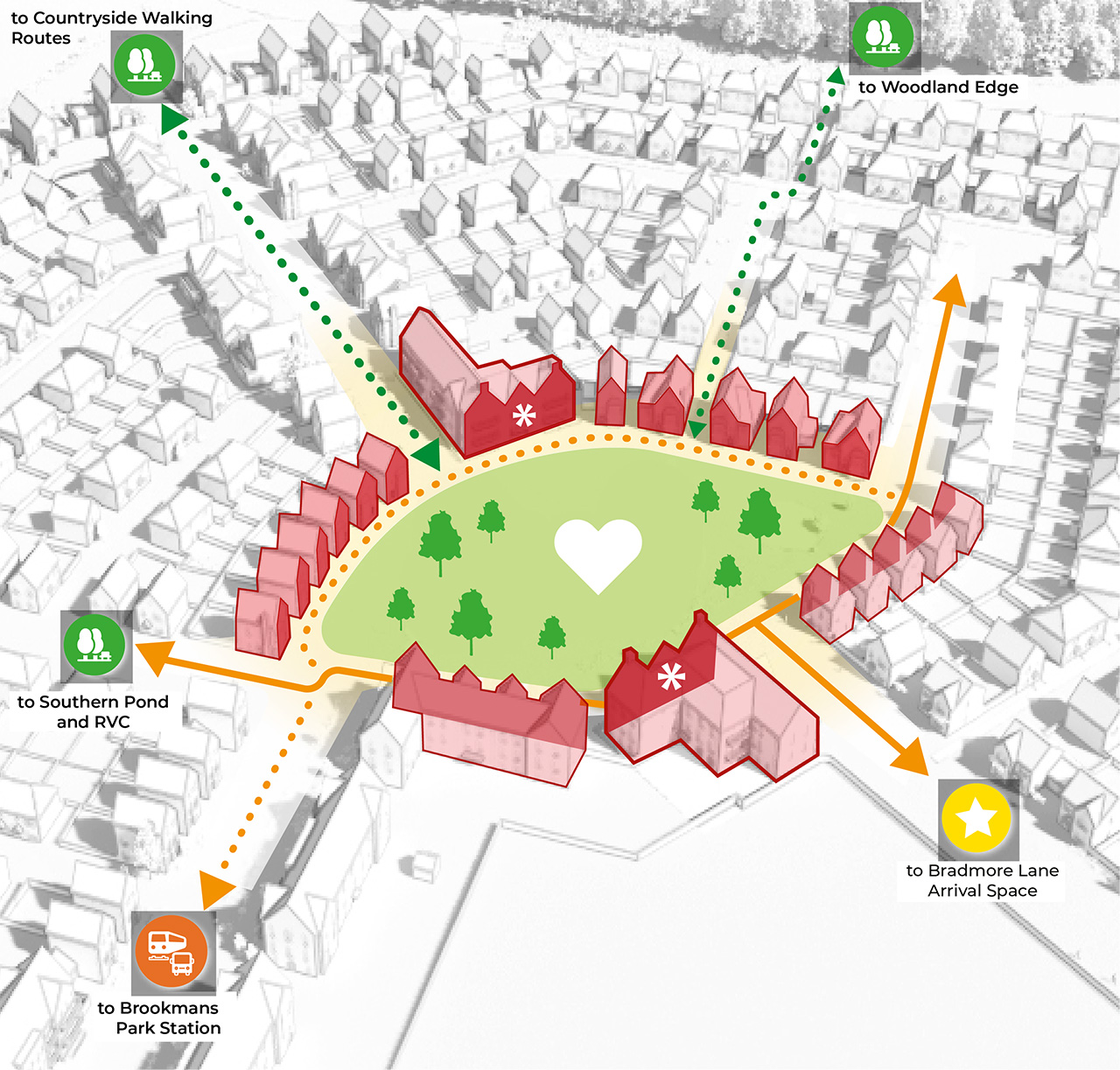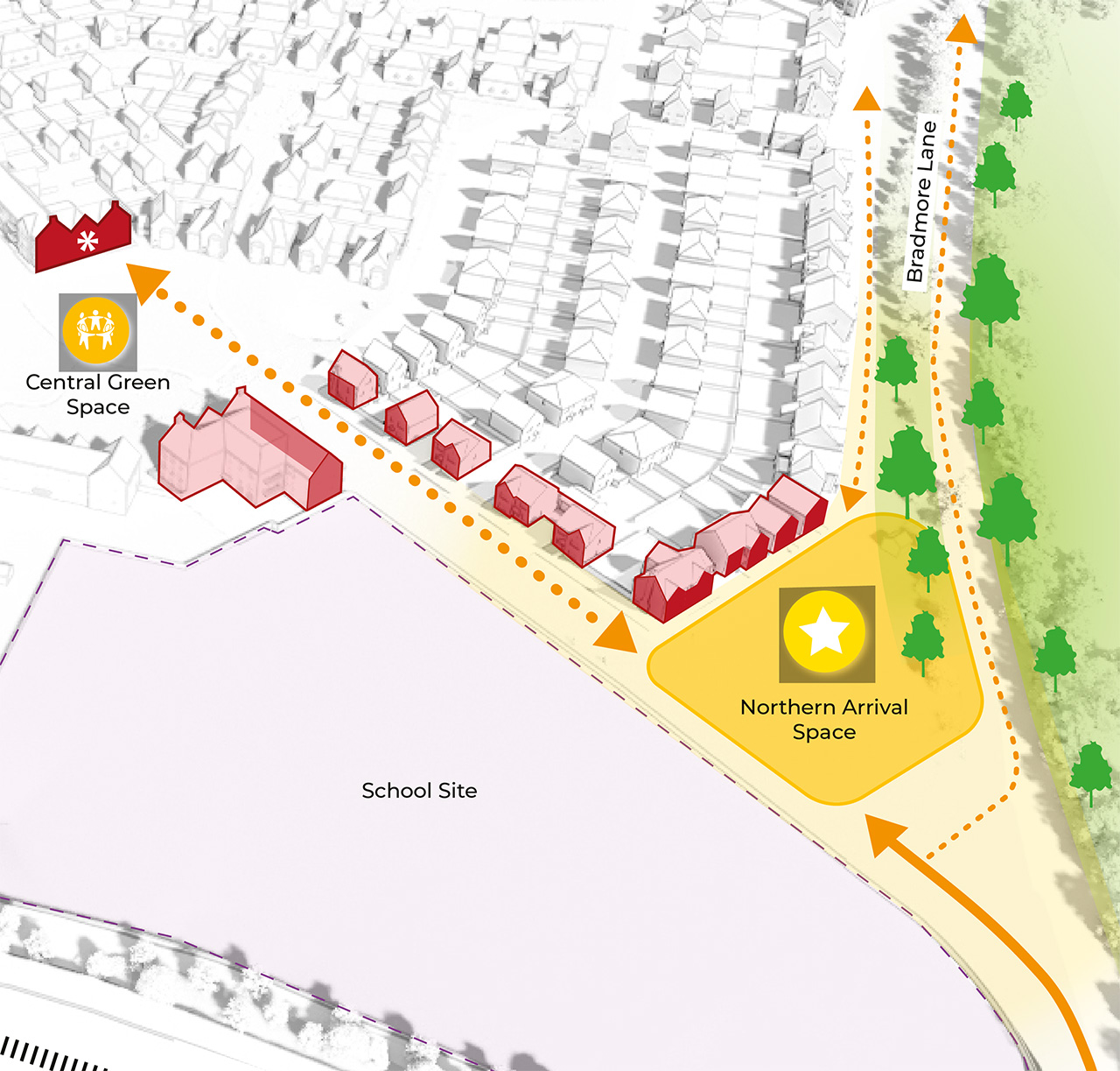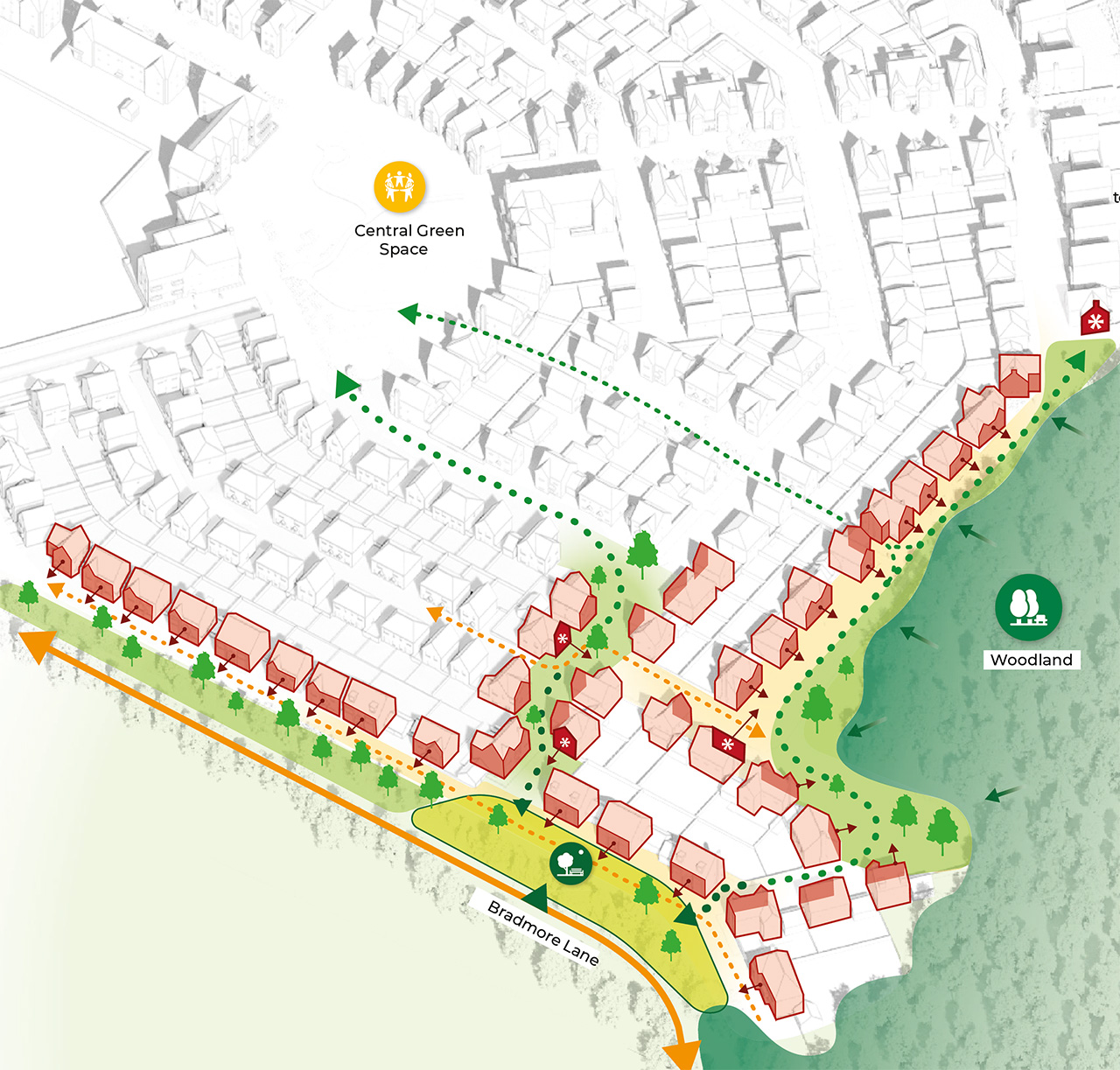 The northern and western edges respond to the mature woodland and existing trees along Bradmore Lane. Informal, shared-surface routes create pedestrian and cycle connections and linkages to public rights of way.