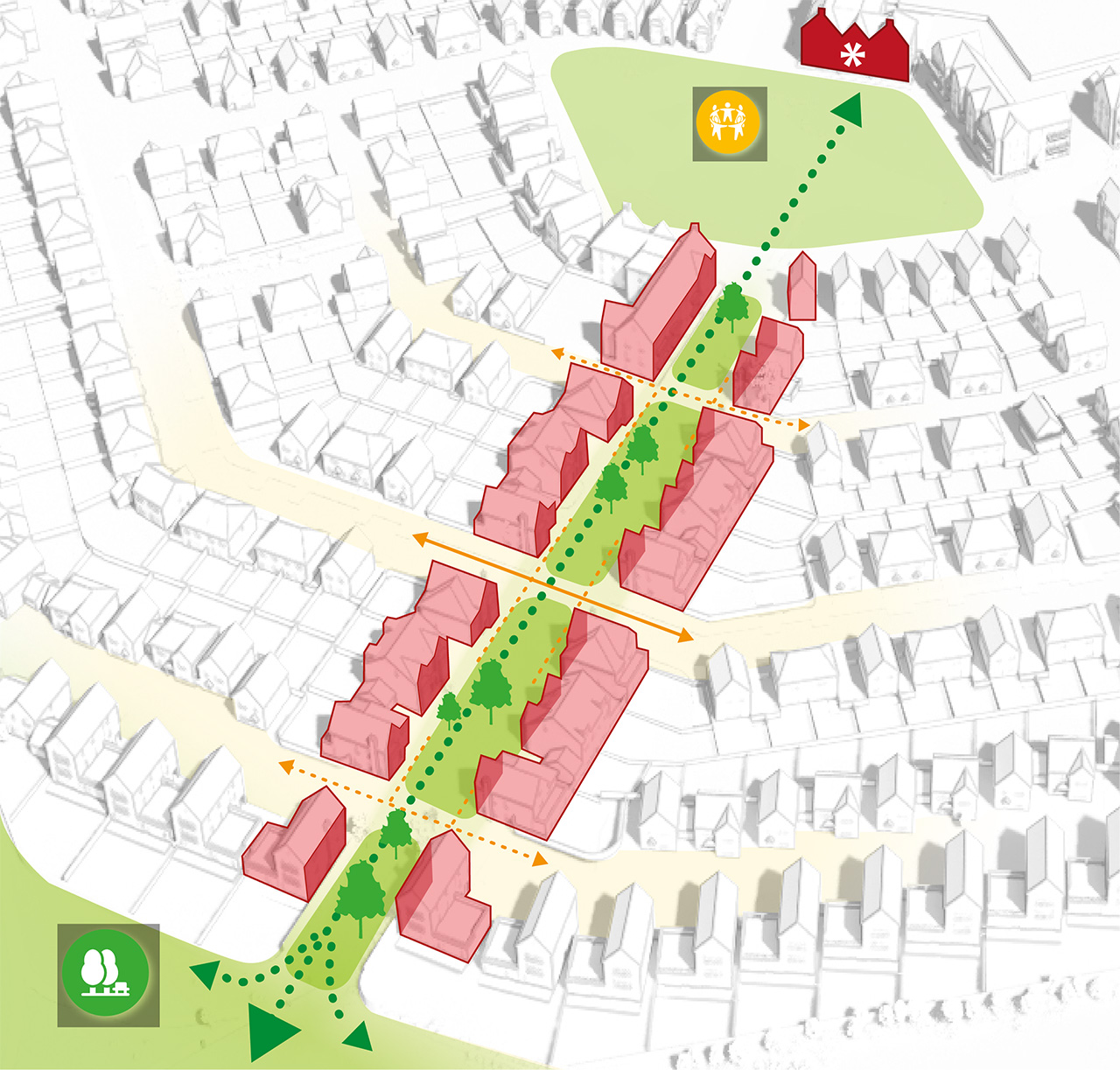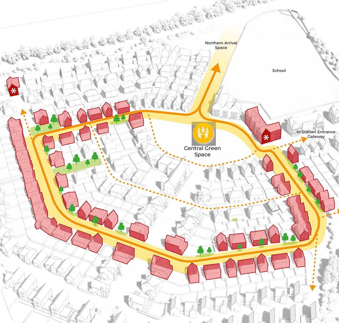 A series of apartment buildings address the eastern edge, overlooking new natural open space and framing informal areas with playful gable arrangements. A larger landmark building anchors the southern edge near the play space.