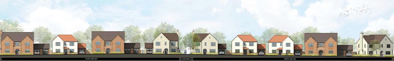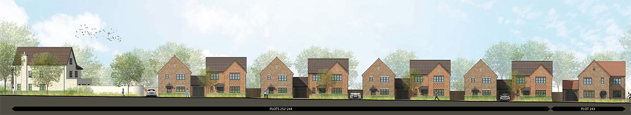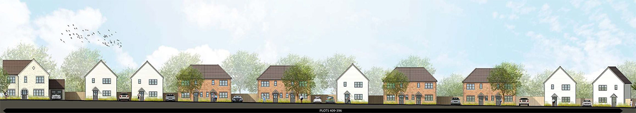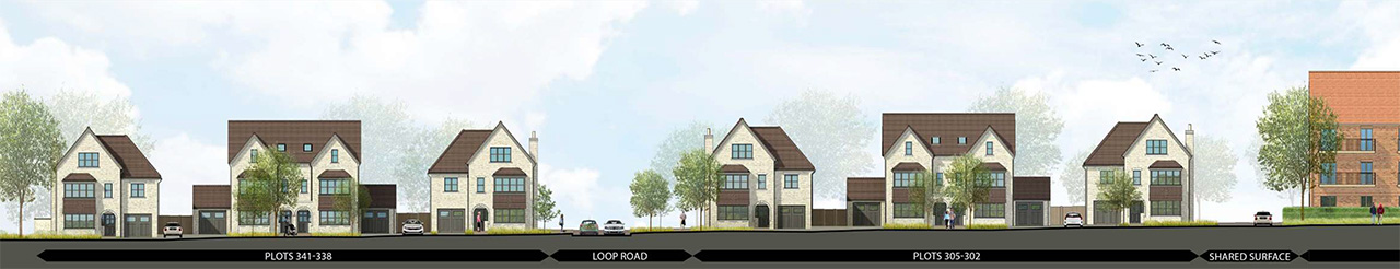 The proposals become less formal as they transition towards the open countryside and woodland edge towards the northern, southern and western boundaries, using more natural materials and colours with detached homes.