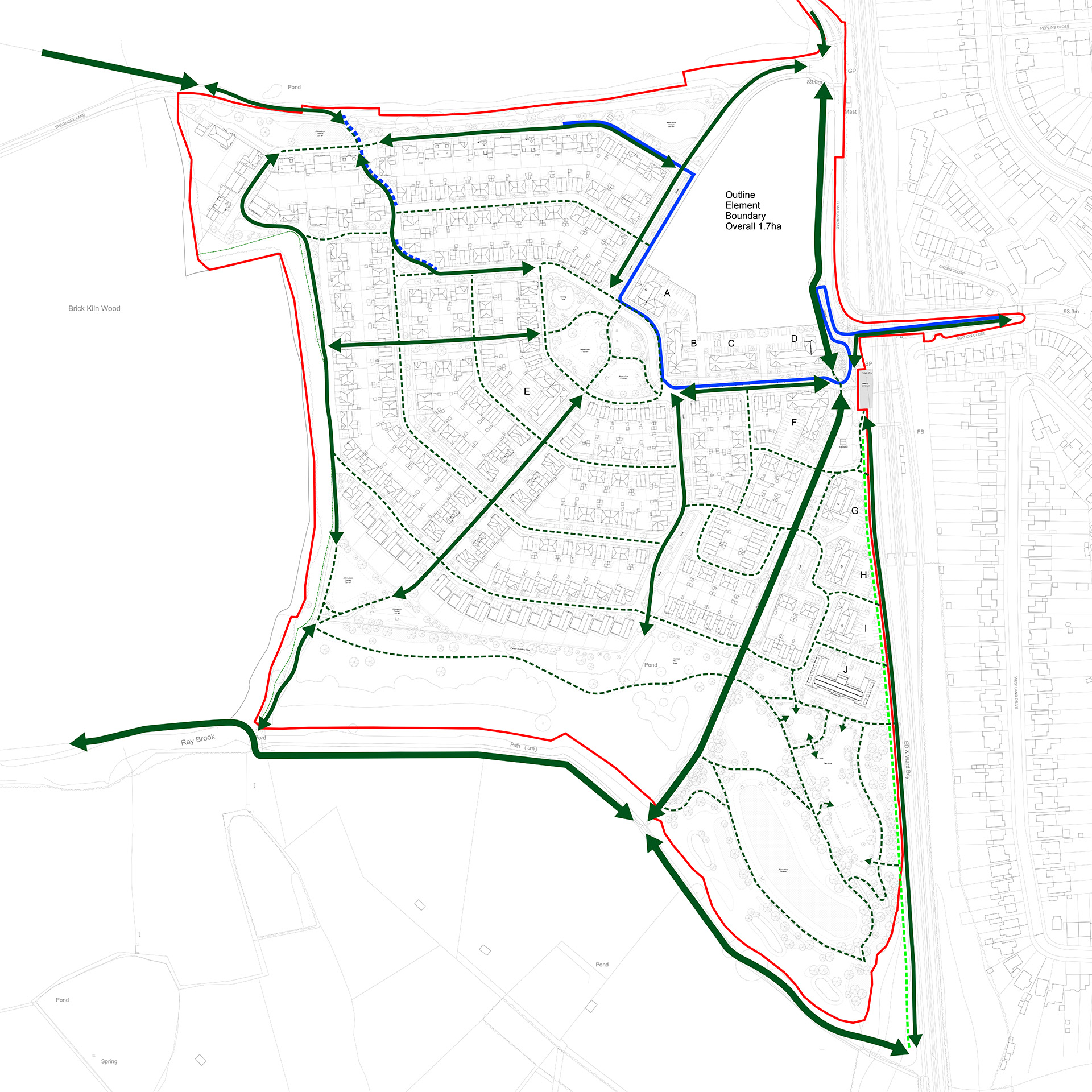 The central green spine includes a pedestrian route separated from traffic, with links to the woodland edge, creating attractive walking routes through the site. Existing public rights of way are retained and enhanced, maintaining connections to the wider network of paths leading to Ray Brook, Hawkshead Lane, and the Royal Veterinary College campus.