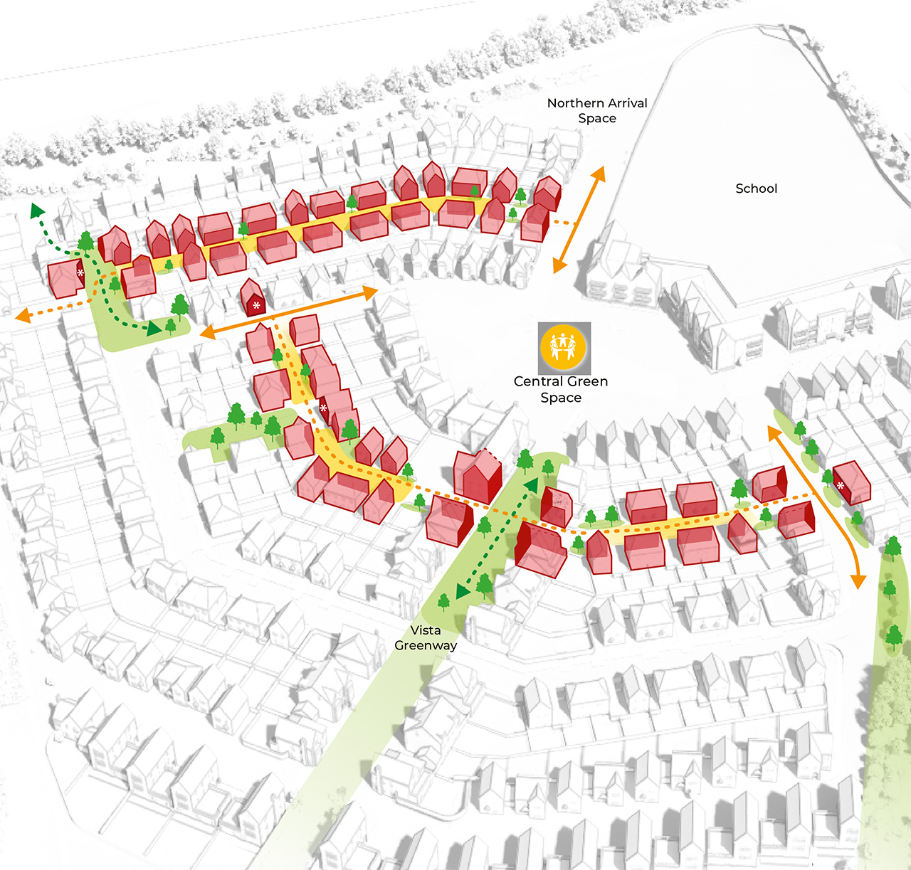 The Vista Greenway provides a green pedestrian route from the south-west of the site into the central green, deliberately aligned to capture views of surrounding countryside. It is overlooked along its length, with homes arranged in small groups to create a human-scaled, legible sequence of spaces.
