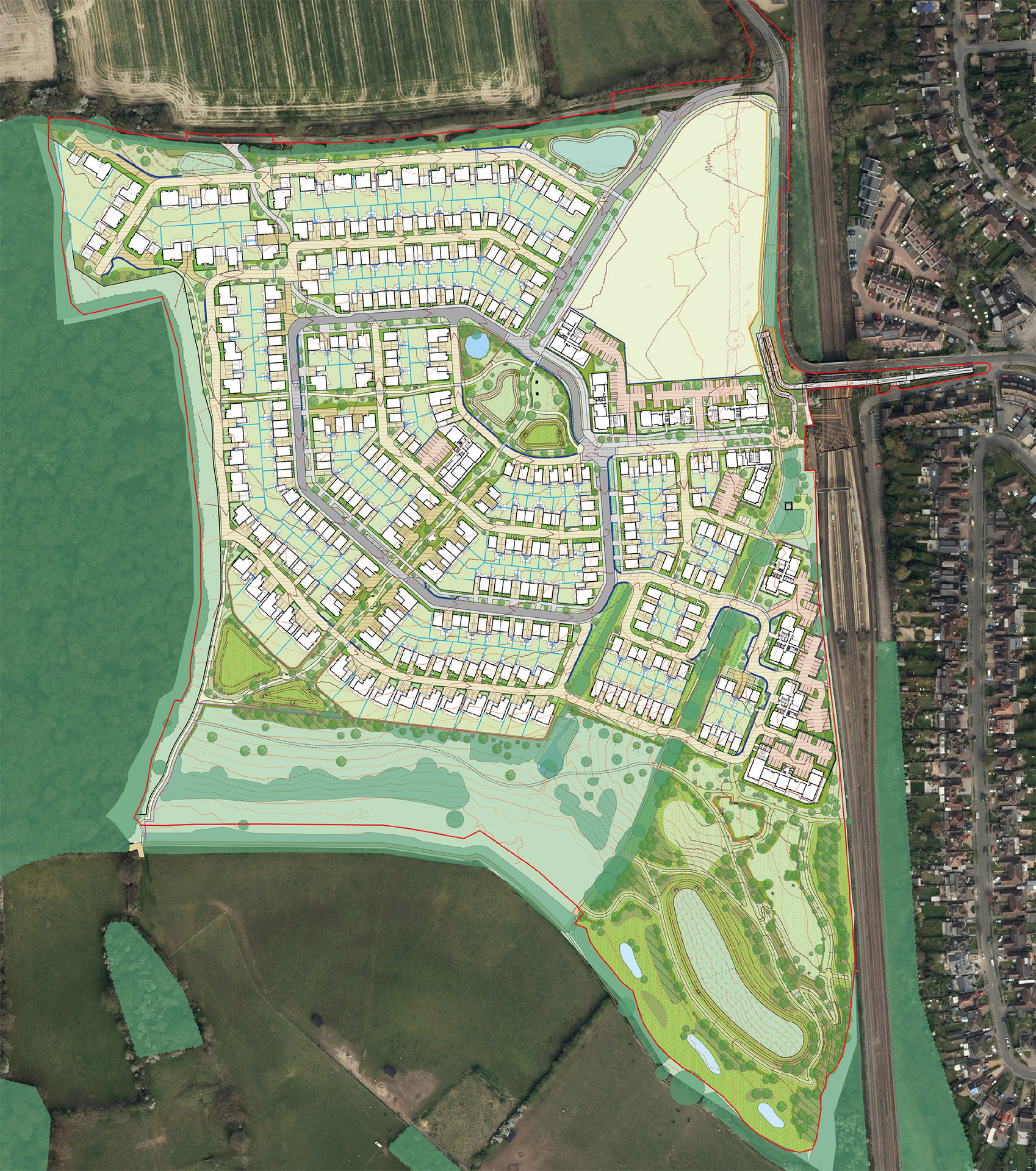 • A new connection between the site, railway station entrance and village in the form of a new pedestrian and cycle bridge over the railway line.