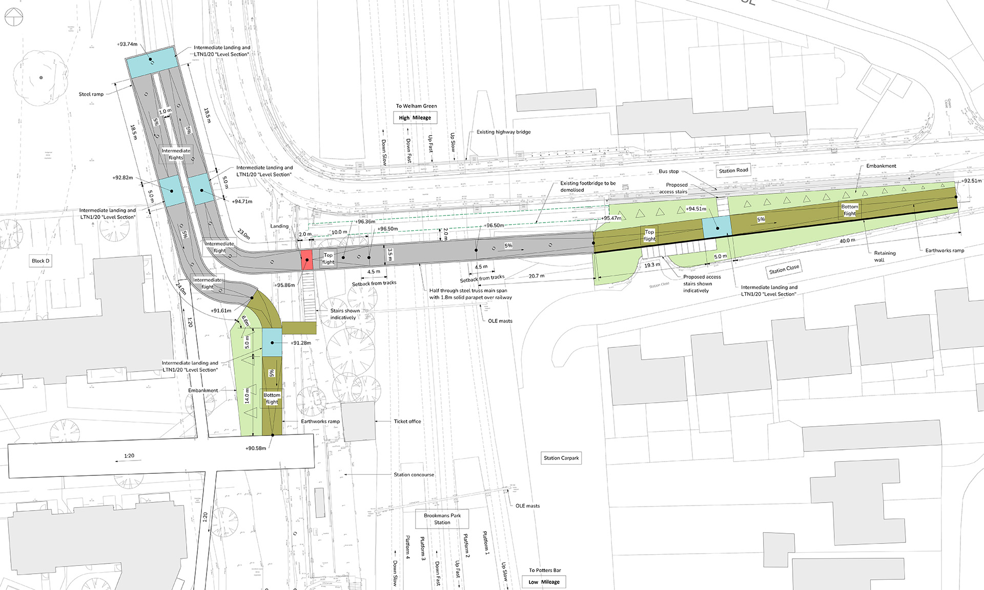 A second arrival point is created where the rail bridge meets the development and station, forming a dedicated pedestrian and cycle gateway from Brookmans Park and the station. Terraces, steps and new planting provide a sociable, accessible space. Building forms, entrances and detailing have been designed to create identity and character, with varied setbacks ensuring a welcoming entrance and natural surveillance.